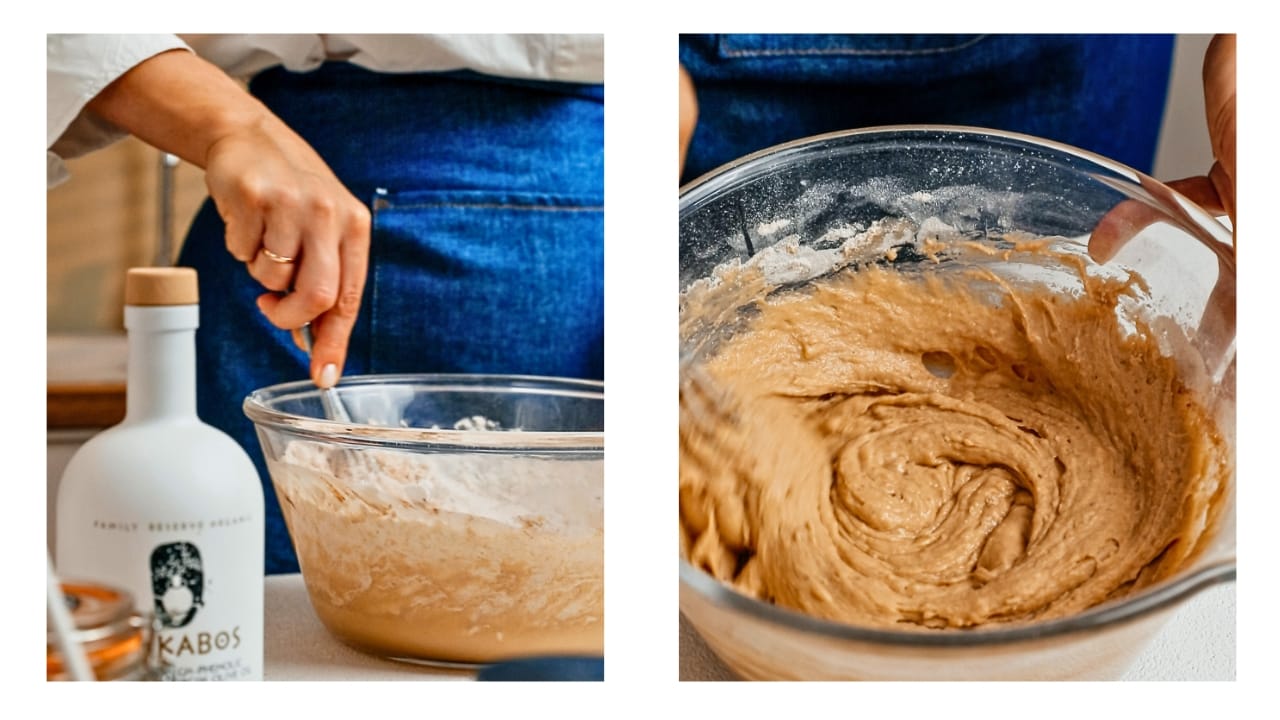 Olive Oil: Add PJ Kabos High-Phenolic Extra Virgin Olive Oil and mix in. (Note: You may always add a tablespoon or so of yogurt or milk if you feel the batter is too thick or…as we do ¼ cup more oil! Milk or yogurt adds moisture while keeping the batter lighter, whereas additional olive oil results in a denser texture. It's all about personal preference.)