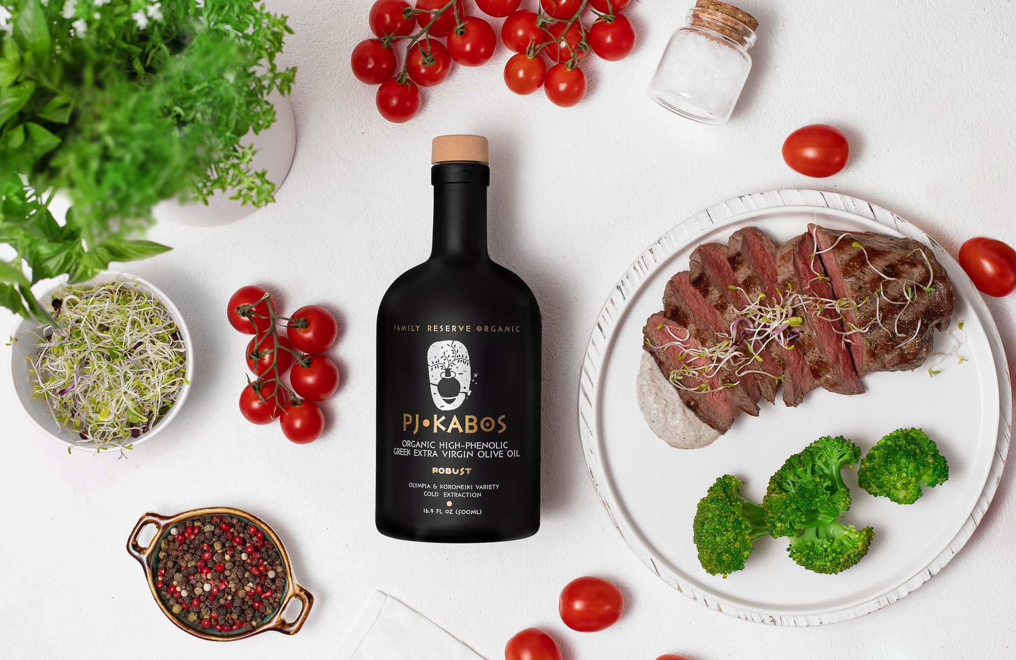 Allow the robust notes of PJ KABOS high-phenolic olive oil to tantalize your palate, creating a harmonious dance of flavors that will leave you craving for more.
