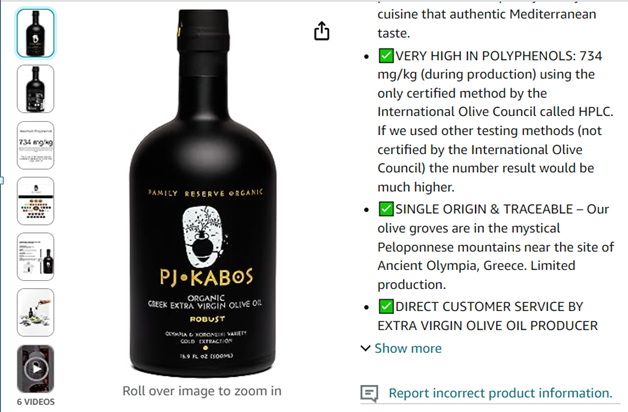 For example, for transparency sake and so that a ready comparison can be made by consumers between different brands of oils, PJ Kabos follows the protocols of the “International Olive Council” (IOC—see below) and our laboratory uses mg/kg. This way, both the consumer and we know exactly the level of phenols that are in the bottle under discussion.