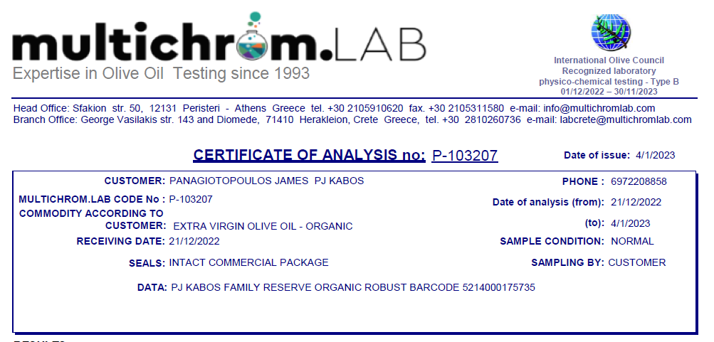 An example of an official laboratory result recognized by the IOC that was performed on our PJ KABOS example, Family Reserve Organic “Robust,” that the HPLC showed to contain 734 mg/kg polyphenols.